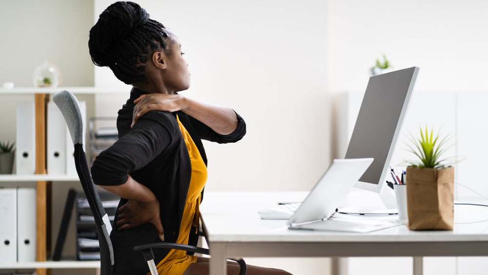 Your feet should be on the ground, and computer keyboards should be within easy reach, so you’re not slumping down or leaning forward.